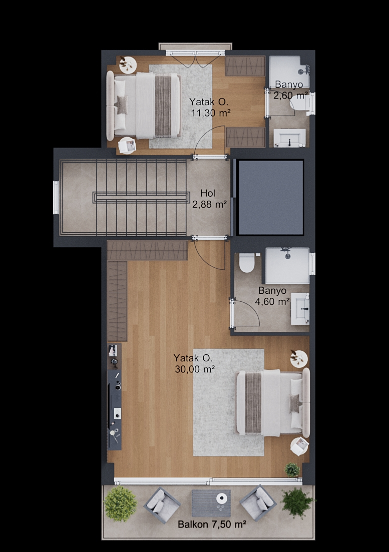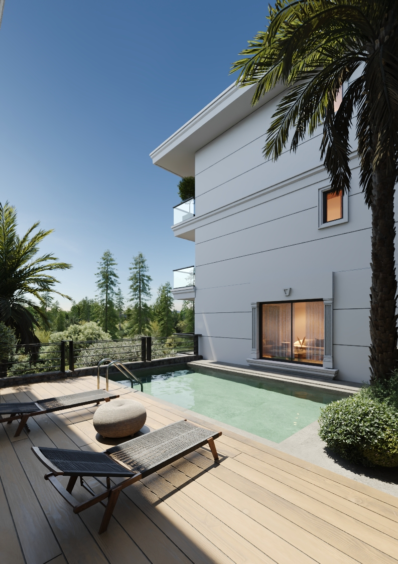 Toplam 250 m² kullanım alanına sahip, 4 katlı ve 4+1 olarak tasarlanan villalarda; her odada ebeveyn banyosu ve villa içi özel asansör bulunmaktadır. Geniş ve ferah yaşam alanları, konforu ön planda tutan detaylarla tamamlanmıştır.