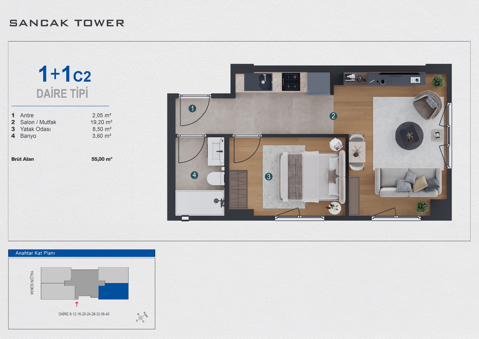 Projemiz kapsamında, 40 adet 1+1 daire inşa edilecek olup, yüksek kalite standartlarında, estetik tasarıma sahip konutlar sizleri bekliyor. Ulaşım kolaylığı sağlayan merkezi konumuyla, hem yatırım hem de yaşam için ideal bir fırsat sunan projemiz, şehrin tüm imkanlarına yakınlığıyla da öne çıkıyor.
